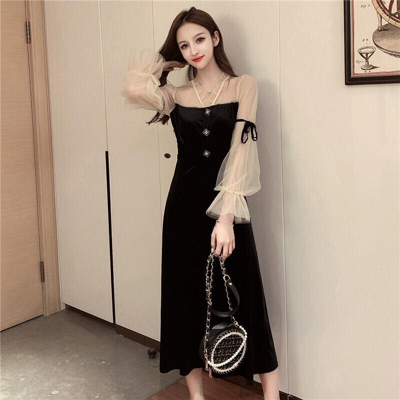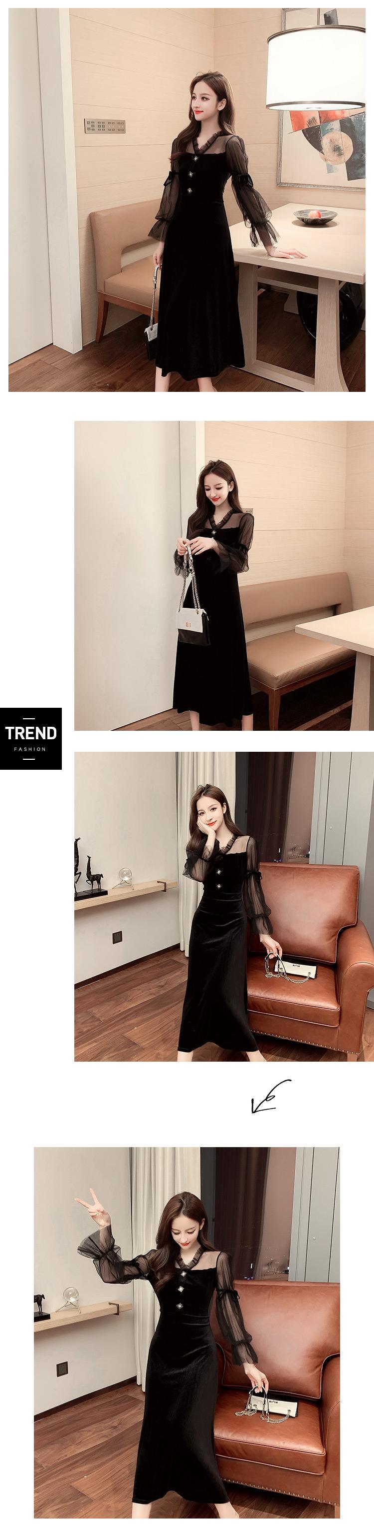 スタンダードベルベットドレス オータムウィンターウェストスタイルブラックロングスカート レトロ 秋物 冬物 ナナファッション32469884840