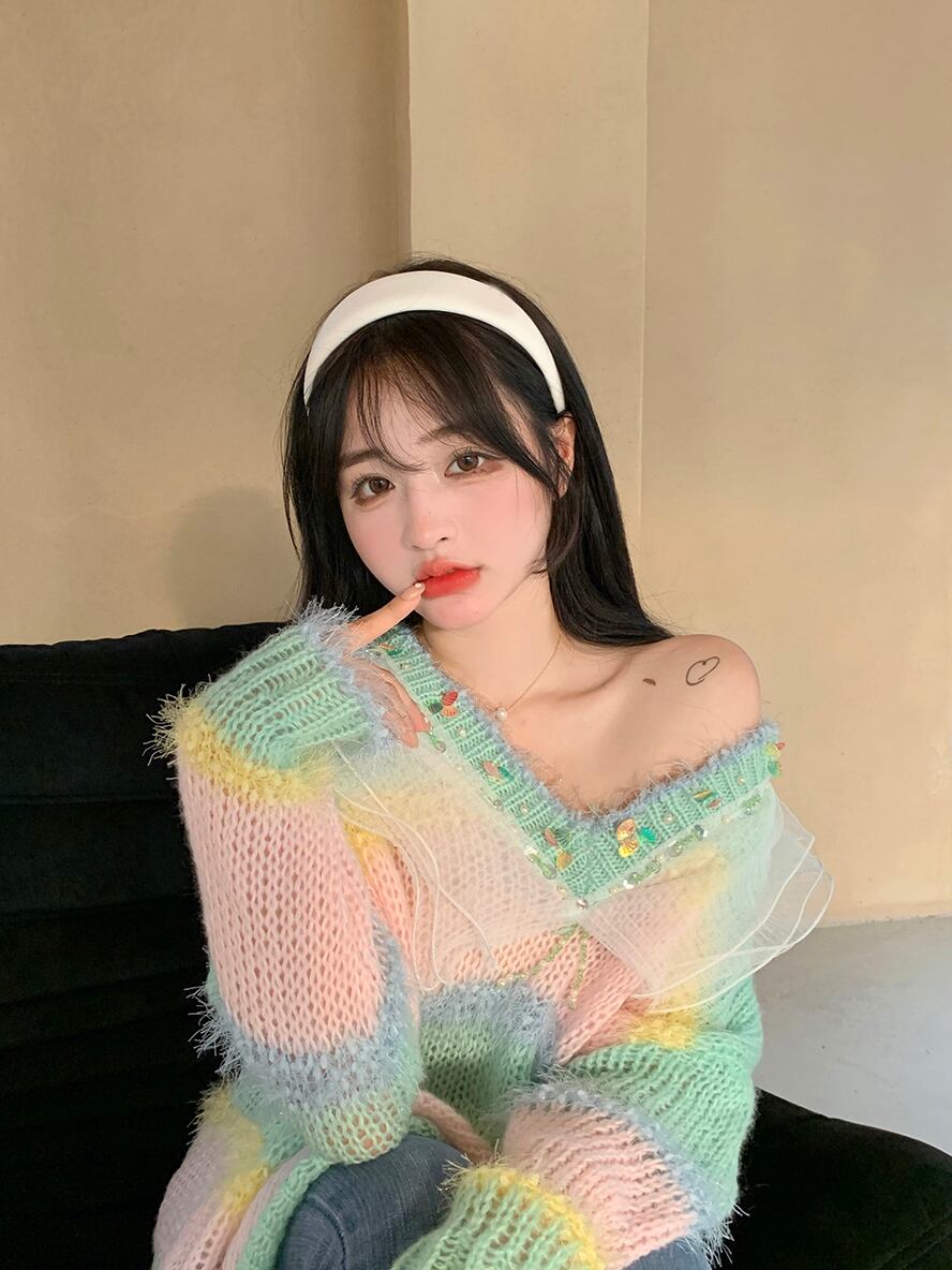 ルーズカラーメッシュVネックニットプルオーバー ブラウス レディース ロング ピュア ステッチ ナナファッション13823599498