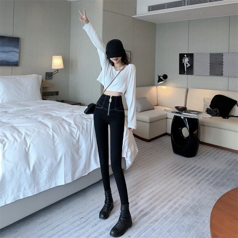 オータムブラックカジュアルパンツ ハイウェストウェスト 秋物 ナナファッション66415879650