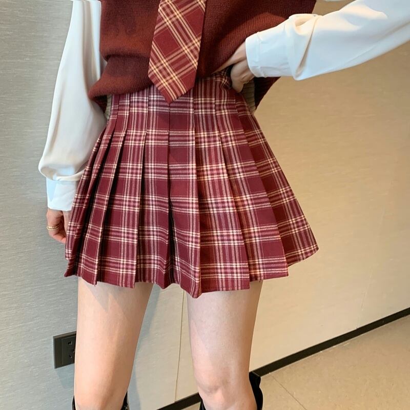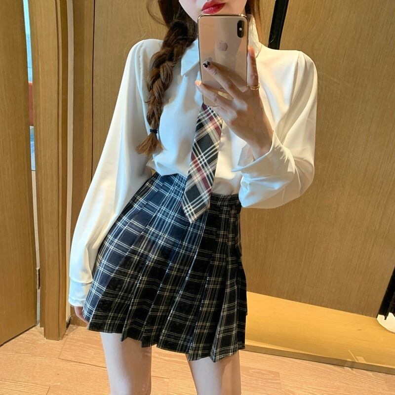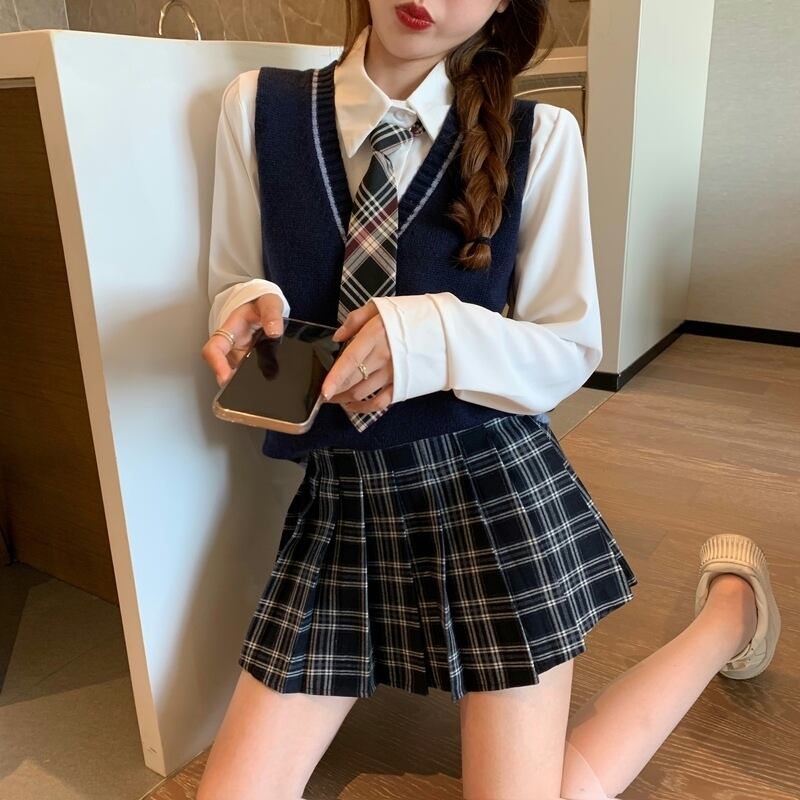 ニットホワイトシャツ ハイウェストウェスト格子柄プリーツスカート ストリート ナナファッション22880213684
