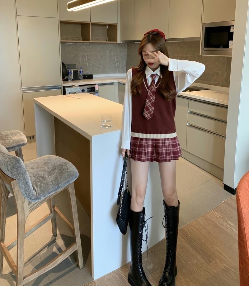 色:ダークレッドのベスト,チベットブルーベスト,シャツ+赤いネクタイ,シャツ+青いネクタイ,赤い格子縞のスカート,ネイビーチェックスカート