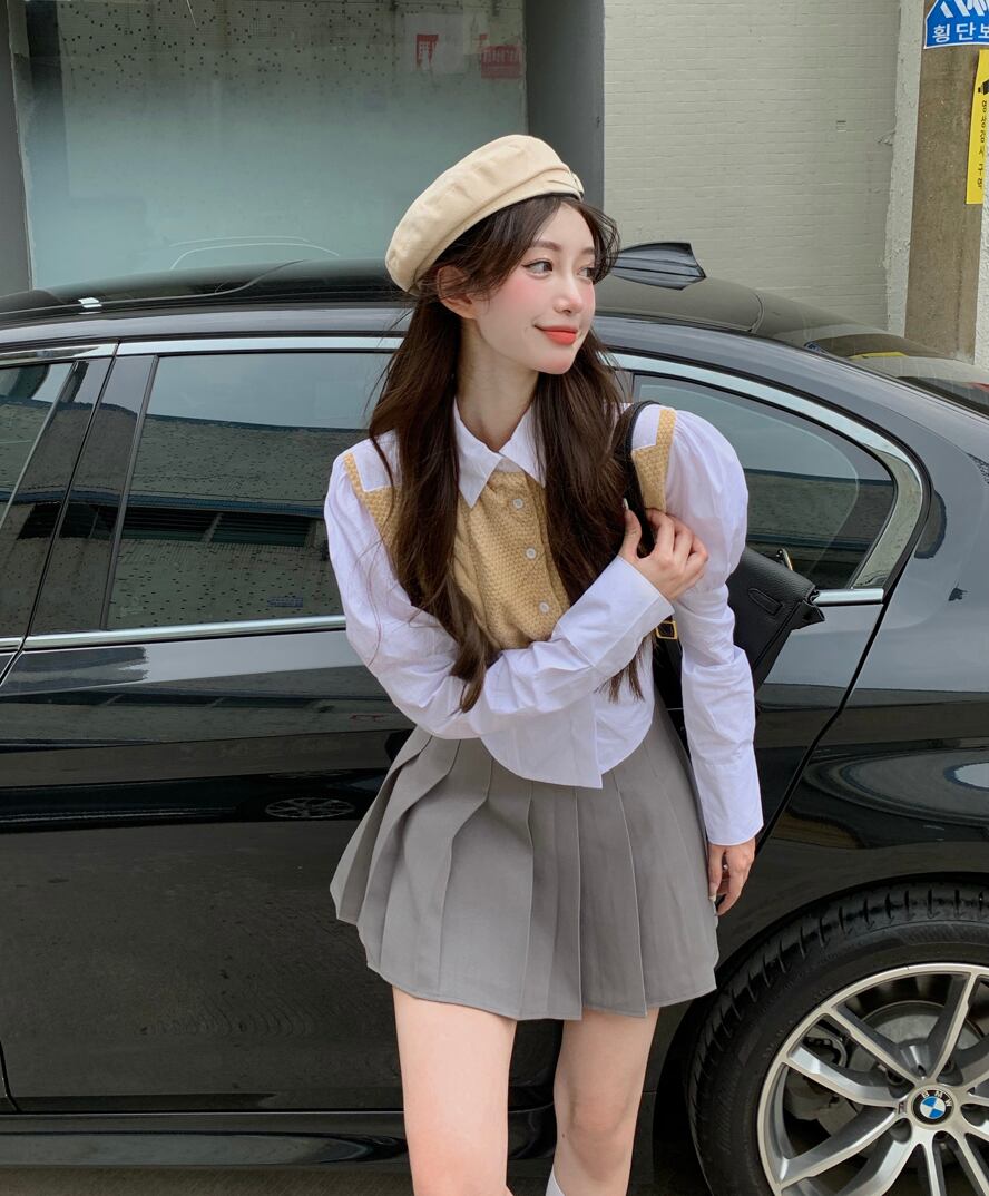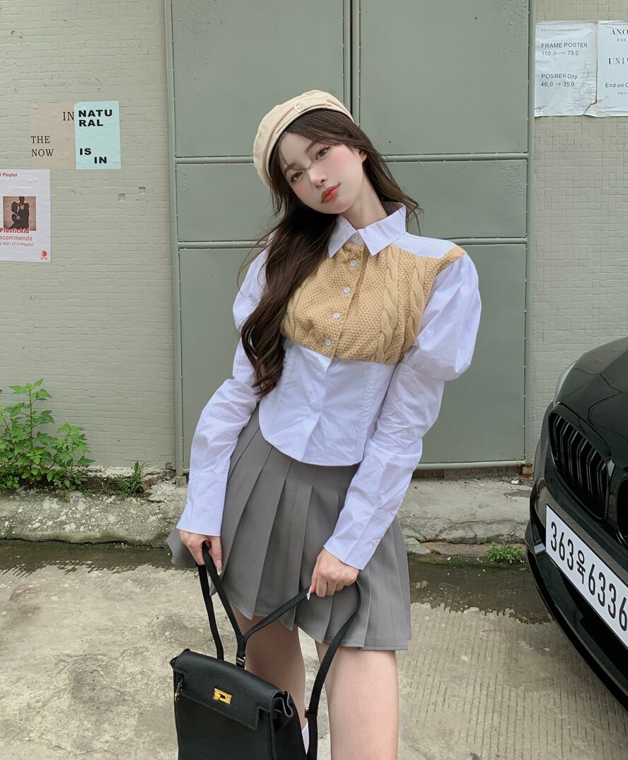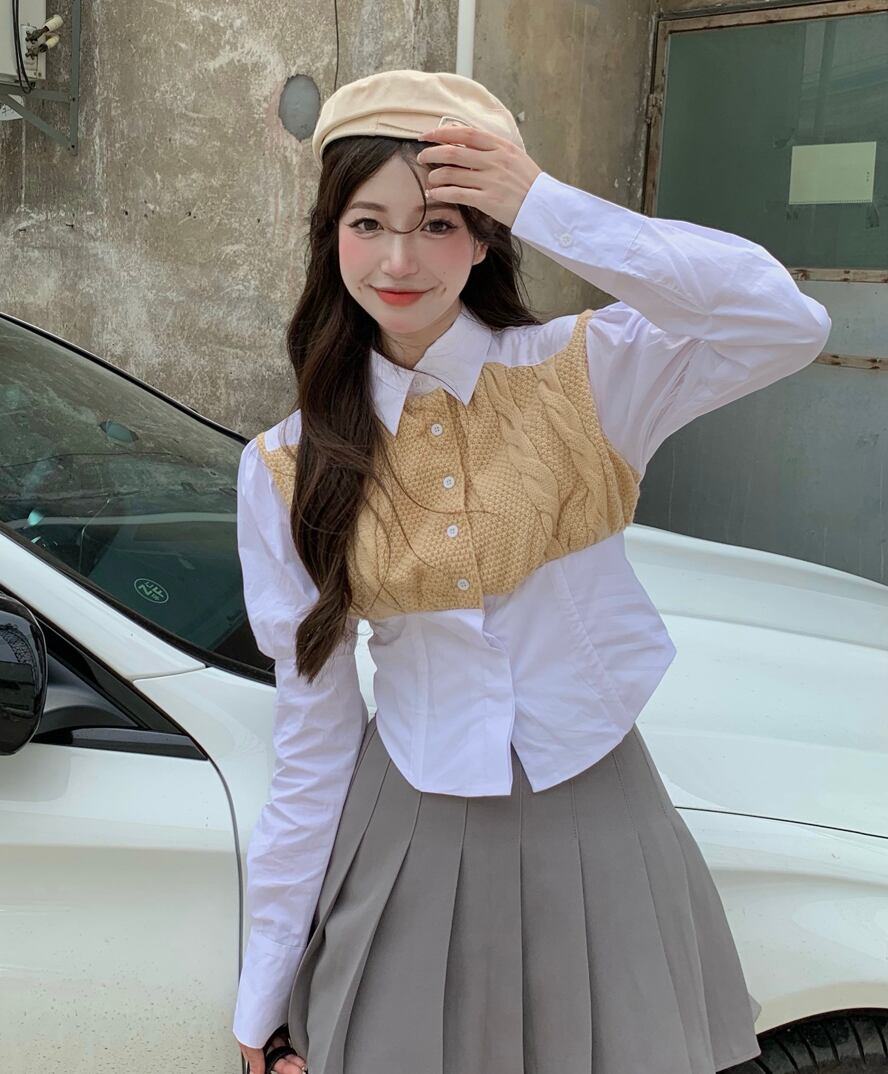 オータムホワイトニットスリーブシャツ ハイウェストウェストプリーツスカート 秋物 ステッチ ナナファッション96566335328