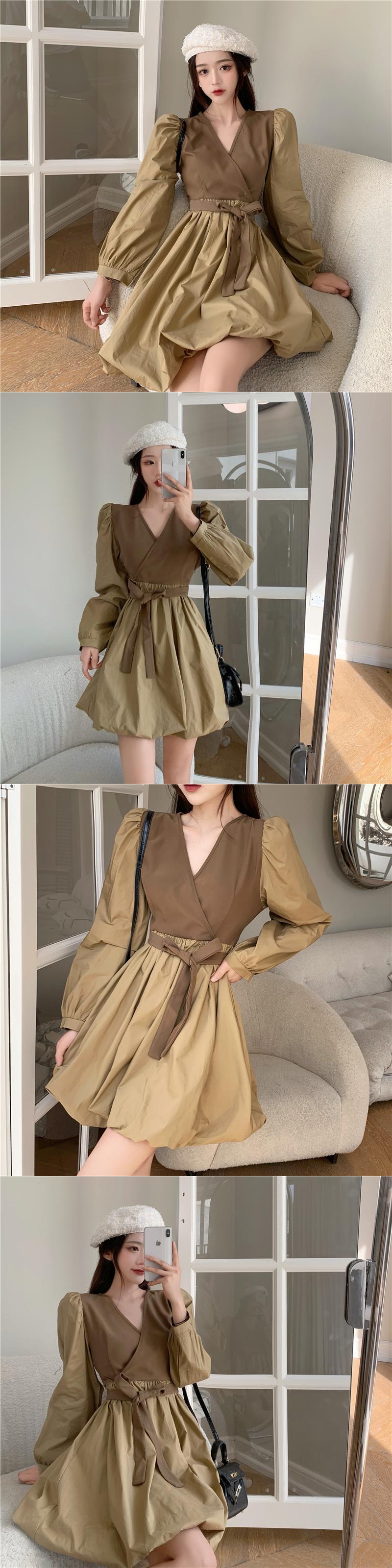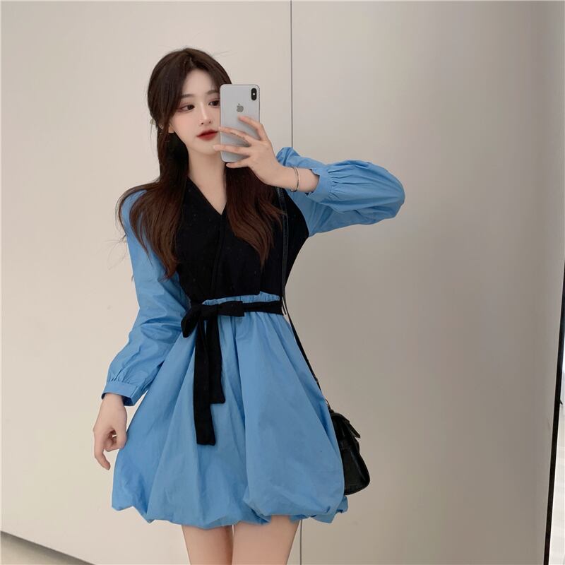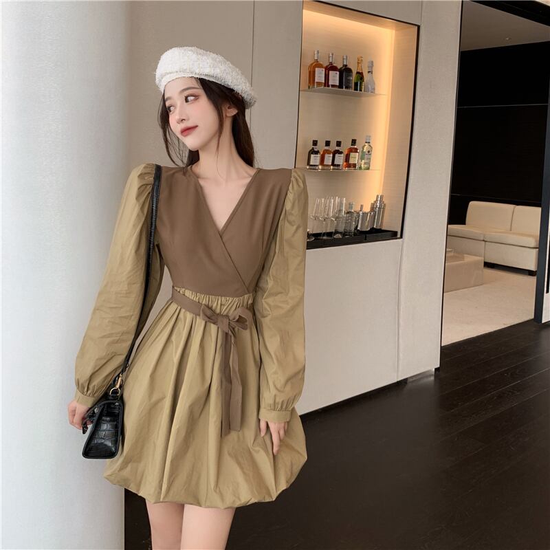 Vネックウェストドレス オータムスリーブスカート 秋物 ナナファッション66002268510