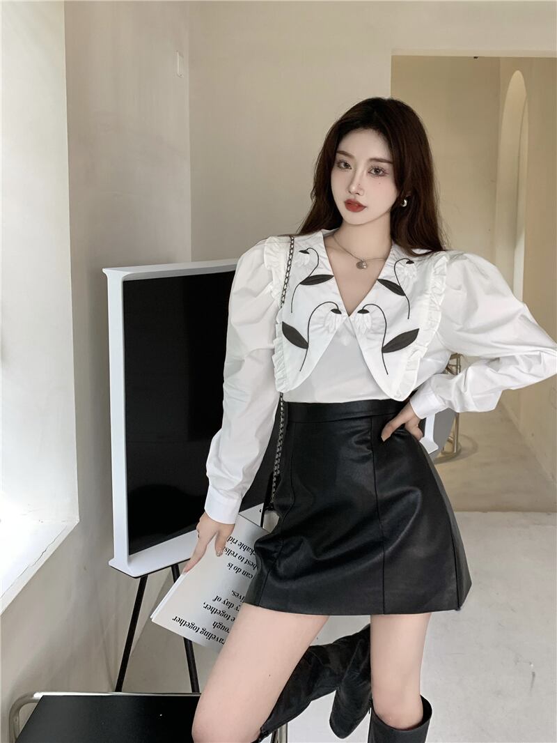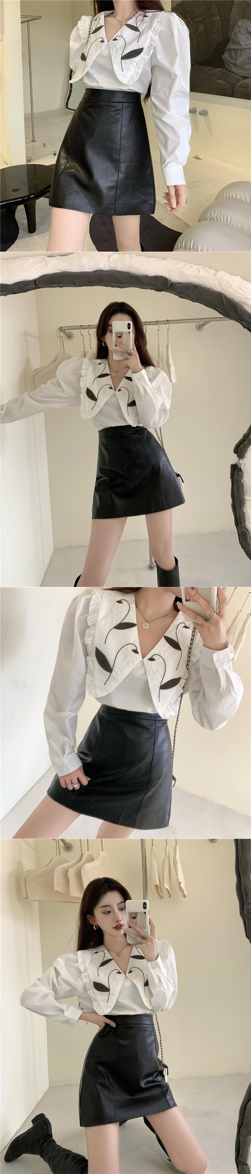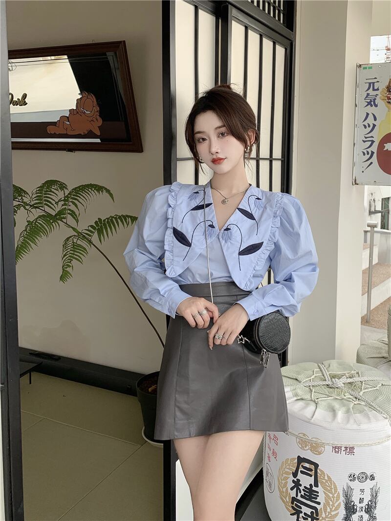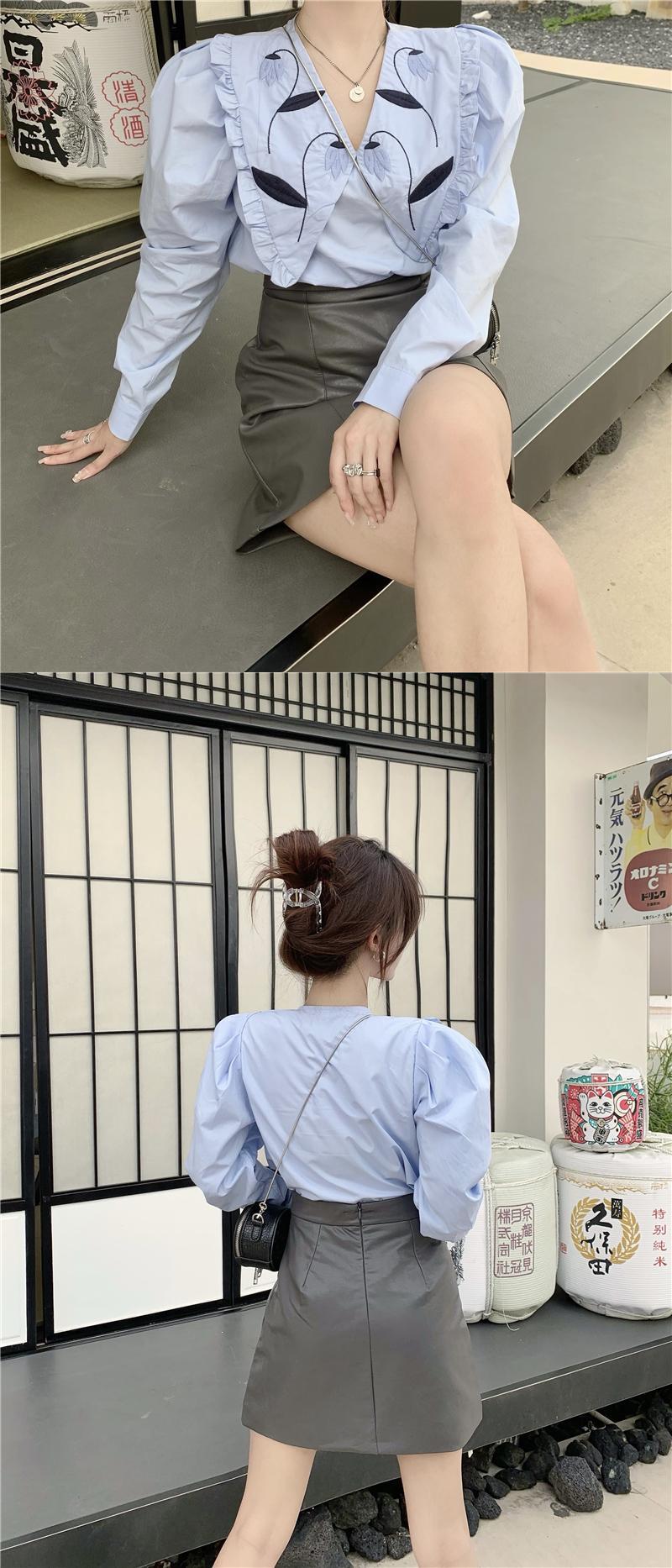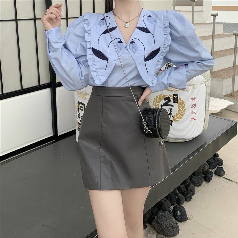 オータムスタイル刺繍シャツ ショートレザースカート ロング ストリート 秋物 ナナファッション16212156118