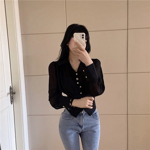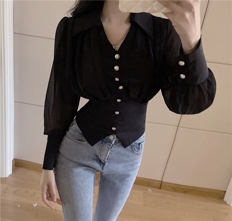 オータムVネックシフォンウェストスリーブプルオーバー シャツ レディース 秋物 ステッチ ナナファッション13752516947