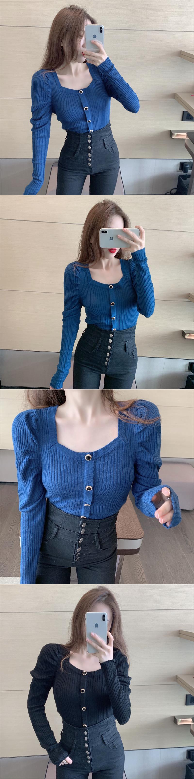 スタンダードスタイルスリーブボタンスリムセーター ニットレディース レトロ スクウェア ナナファッション63141505683