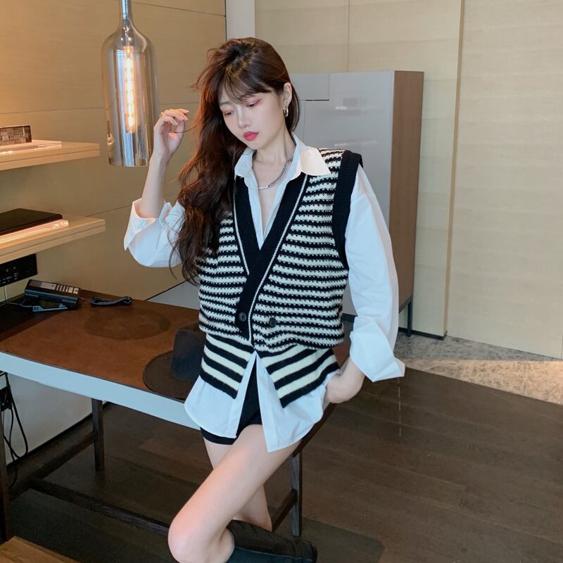 オータムレディースルーズストライプVネックカーディガンニットトップス 秋物 ナナファッション95456883330