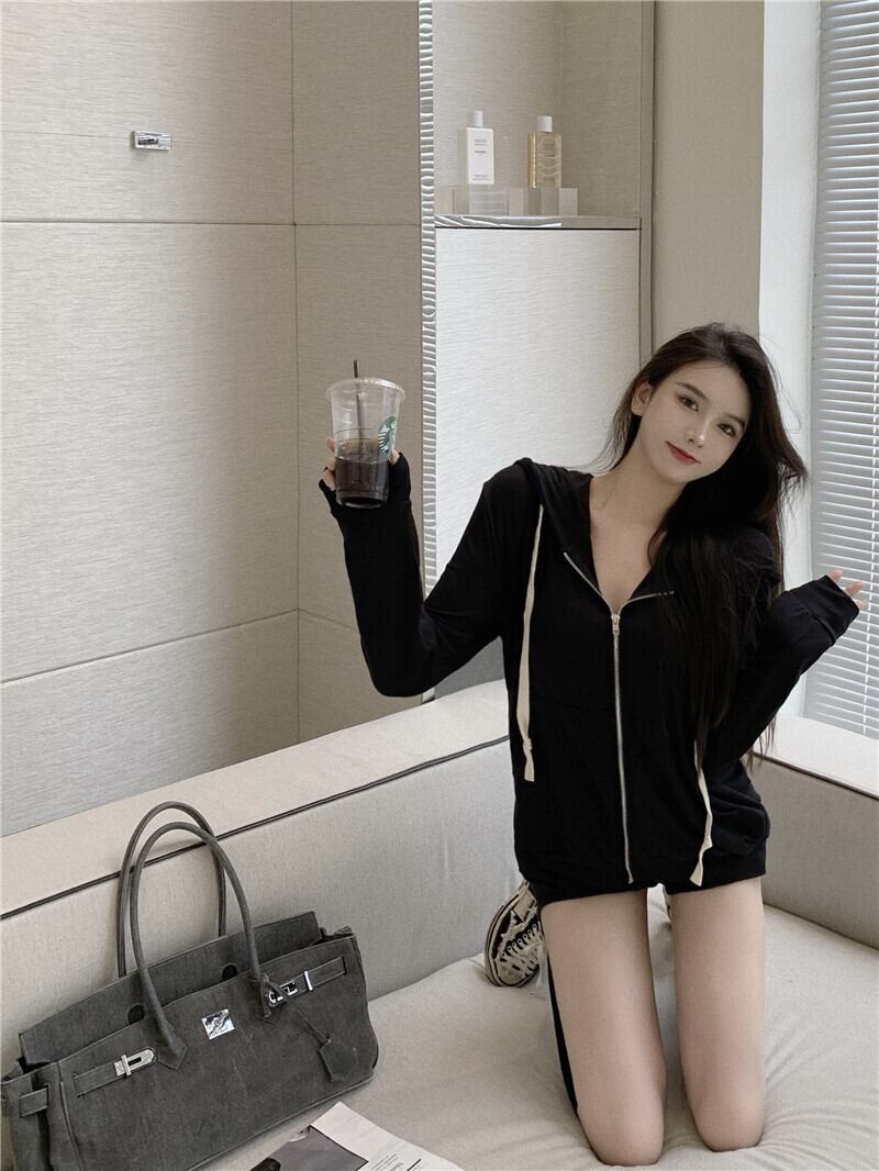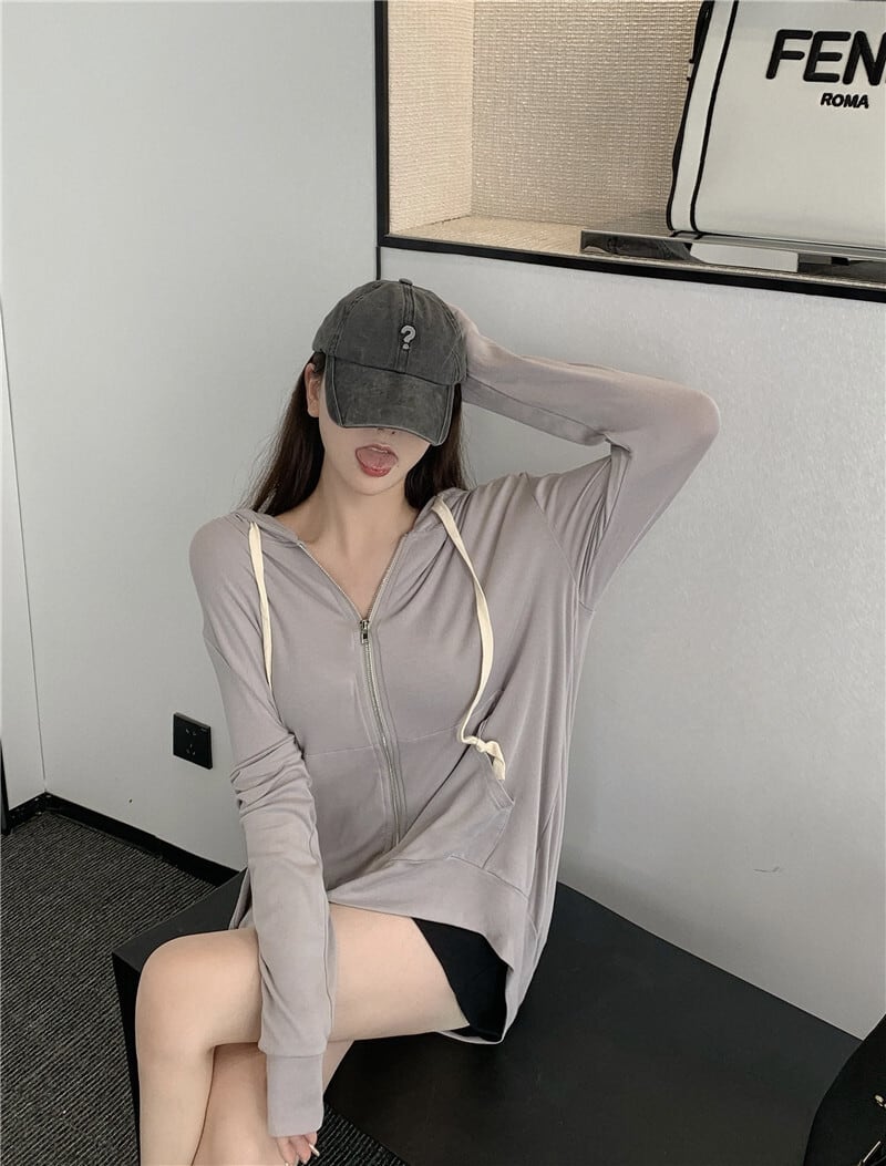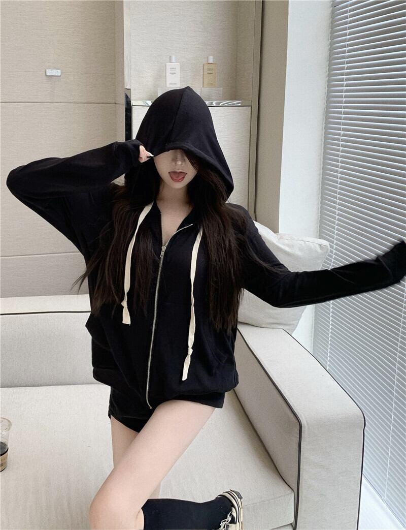 フードジッパーカーディガンセーター スプリングオータム薄手ルーズレッドカジュアルジャケット ロング ストリート 春物 秋物 ナナファッション7226971243