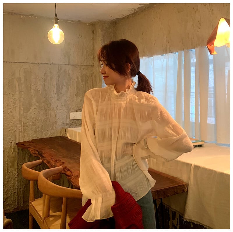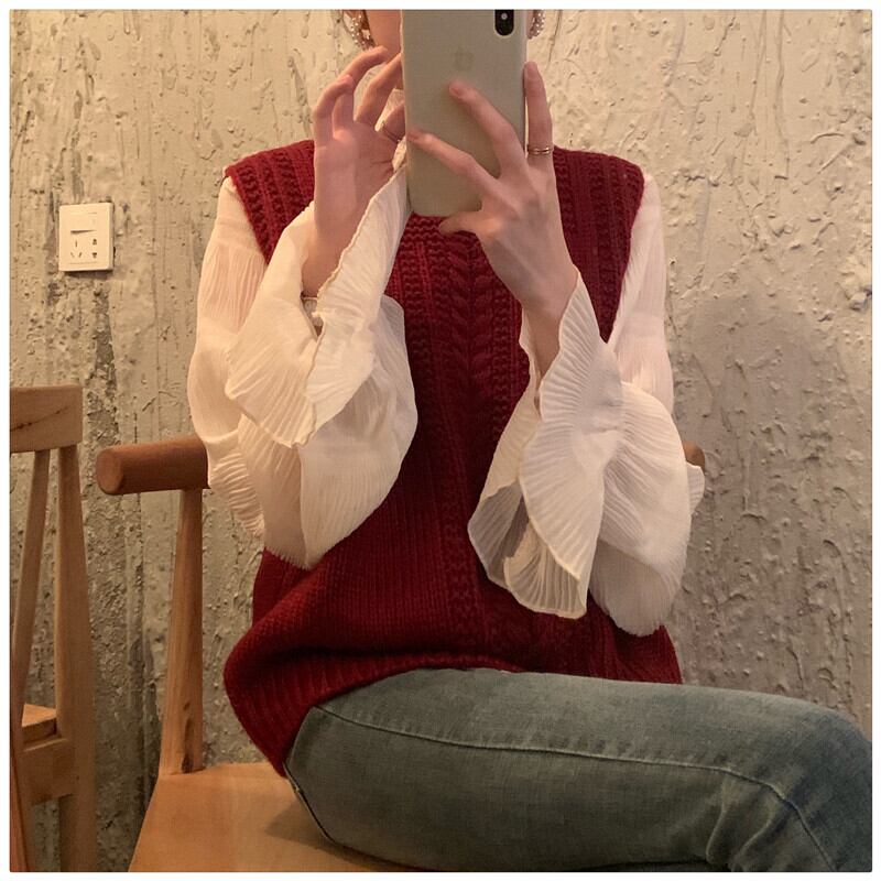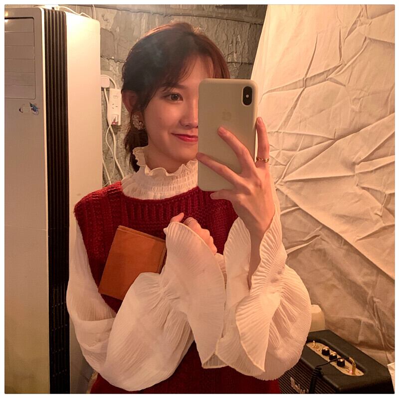 カラースリーブメッシュプリーツシャツ レッドニットレディース ナナファッション52896298607