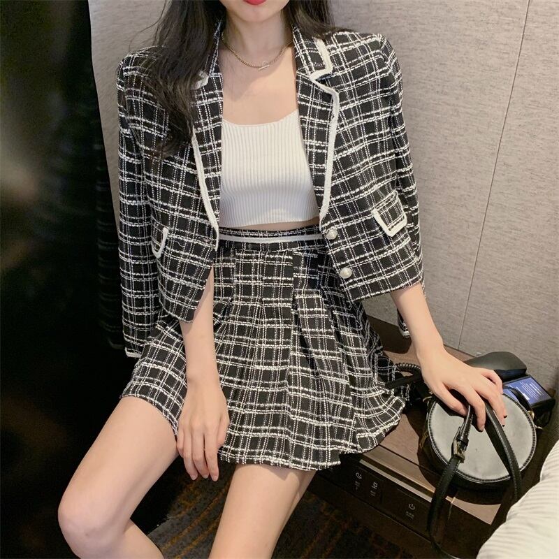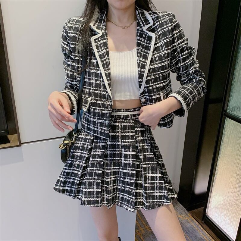 格子柄カーディガンジャケット ハイウェストプリーツスカート ロング ストリート ナナファッション48680838988