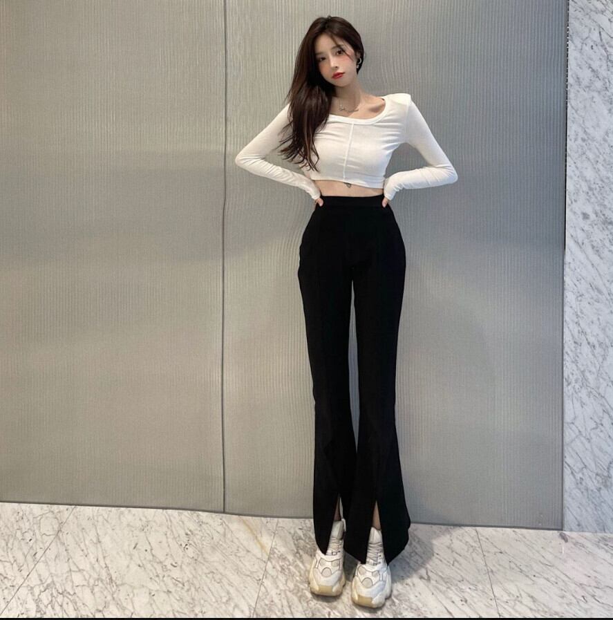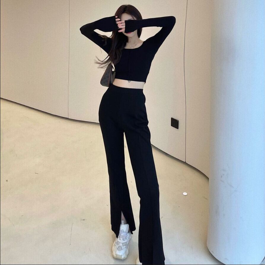 オータムカジュアルパンツ ブラックハイウェスト薄手スリット レッド 秋物 ナナファッション79328196674