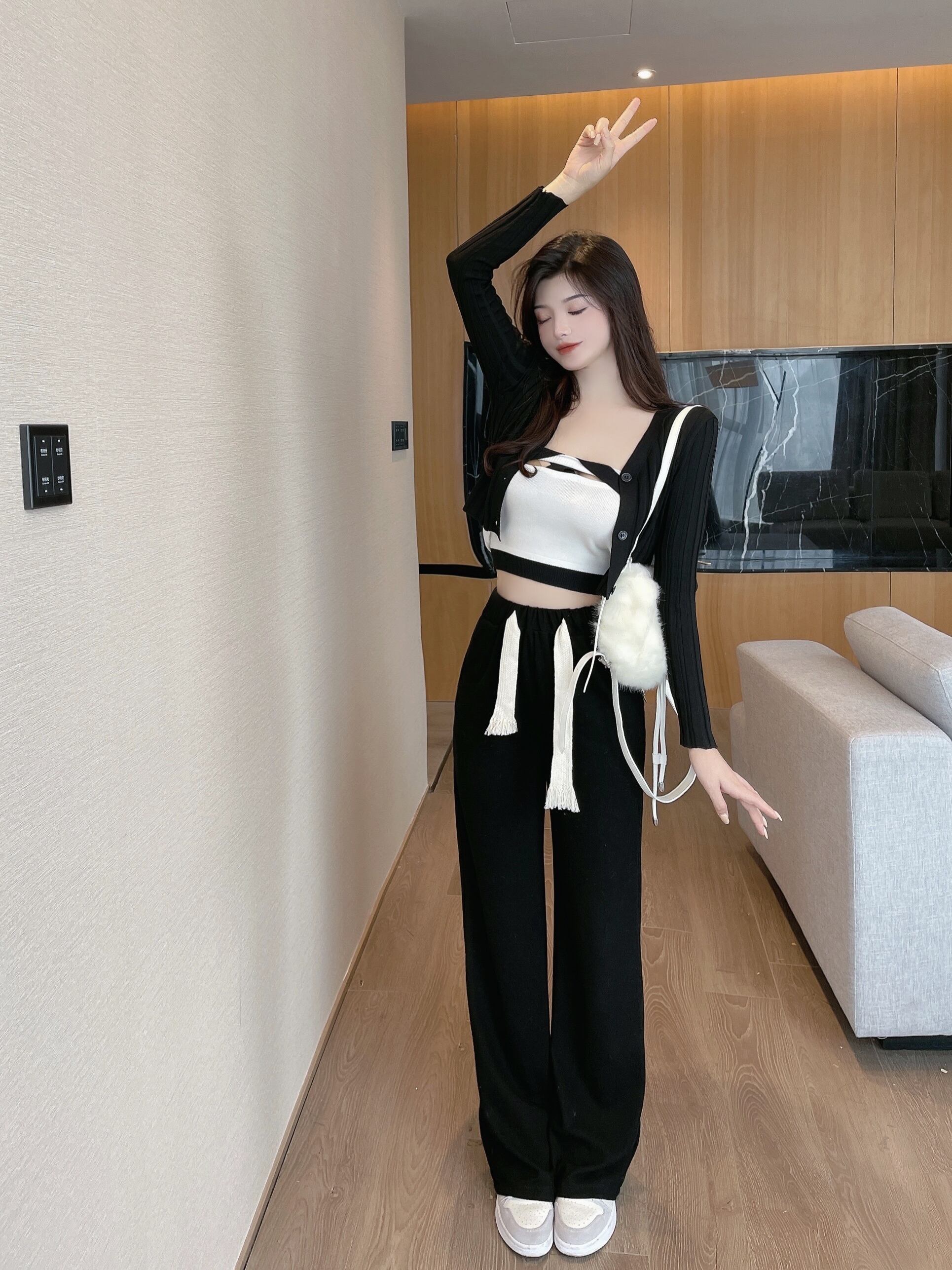 色:ブラックカーディガン,白いチューブトップ,黒いスラックス