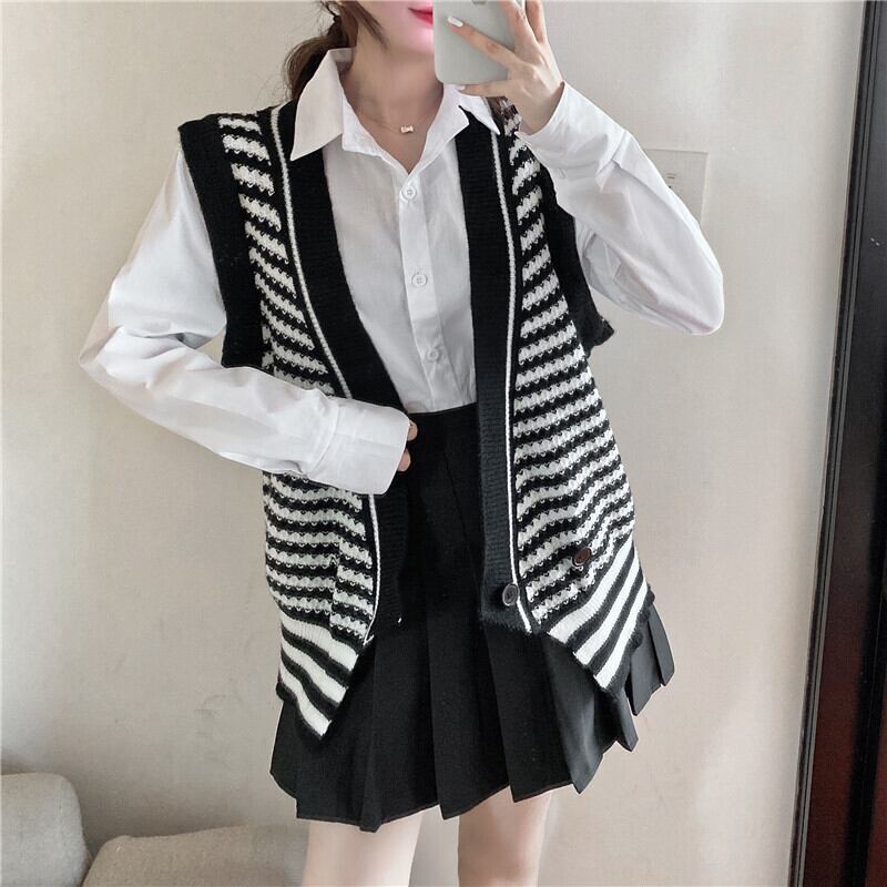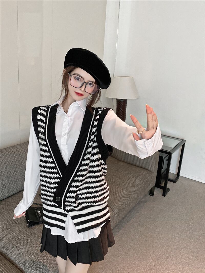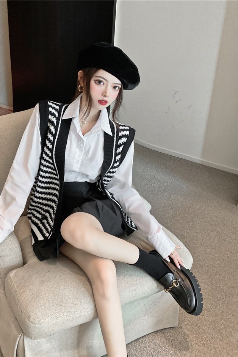 オータムストライプニットソリッド カラーシャツ ハイウェストプリーツスカート 秋物 ソリッドカラー ナナファッション68953939353