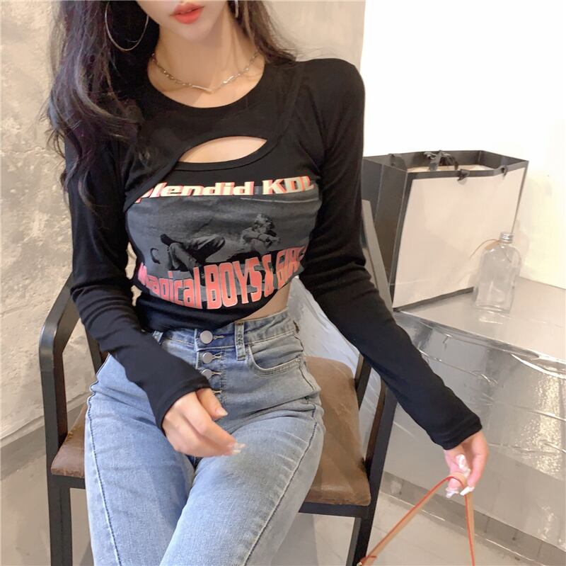 ショートプリントスリムTシャツ オータム ロング 秋物 ナナファッション31808652559