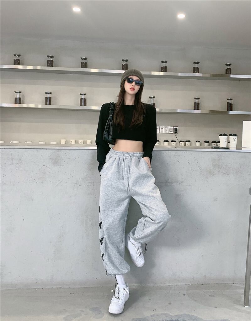オータムスタイルカジュアルパンツ Butterflyデザイン プリント柄ハイウェストウェスト コルセット 秋物 ナナファッション88866380059