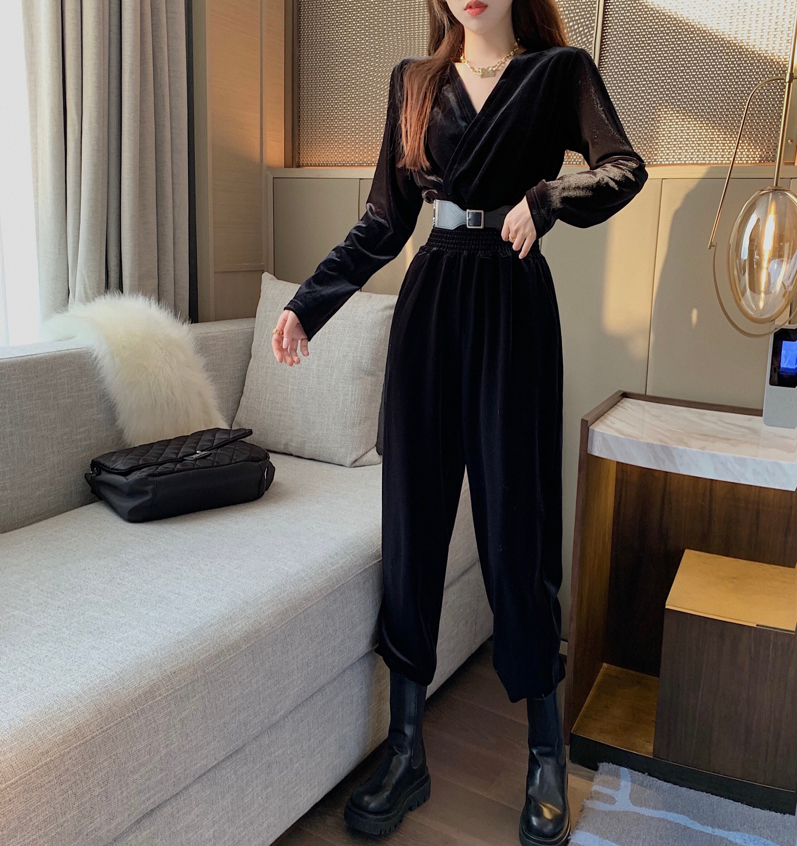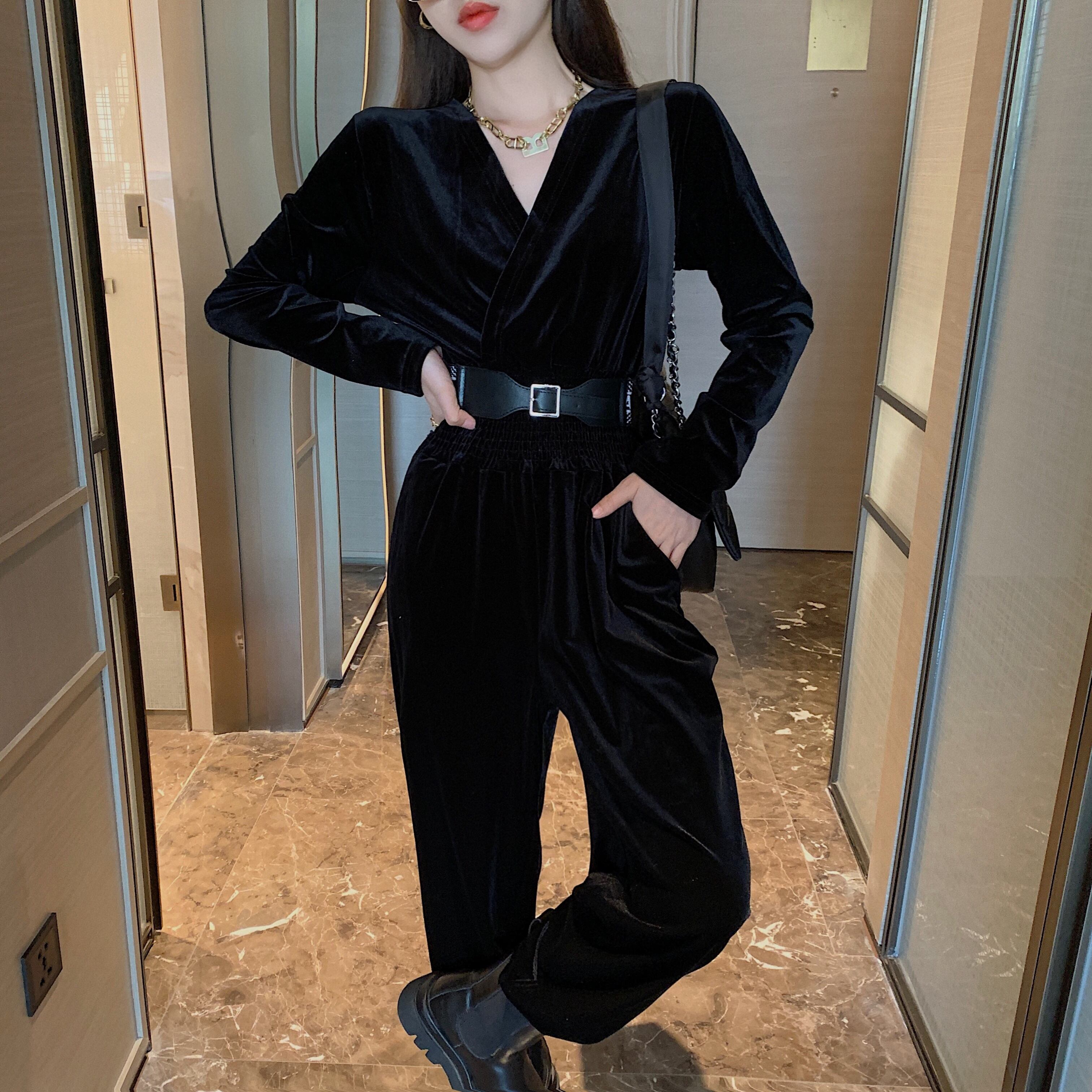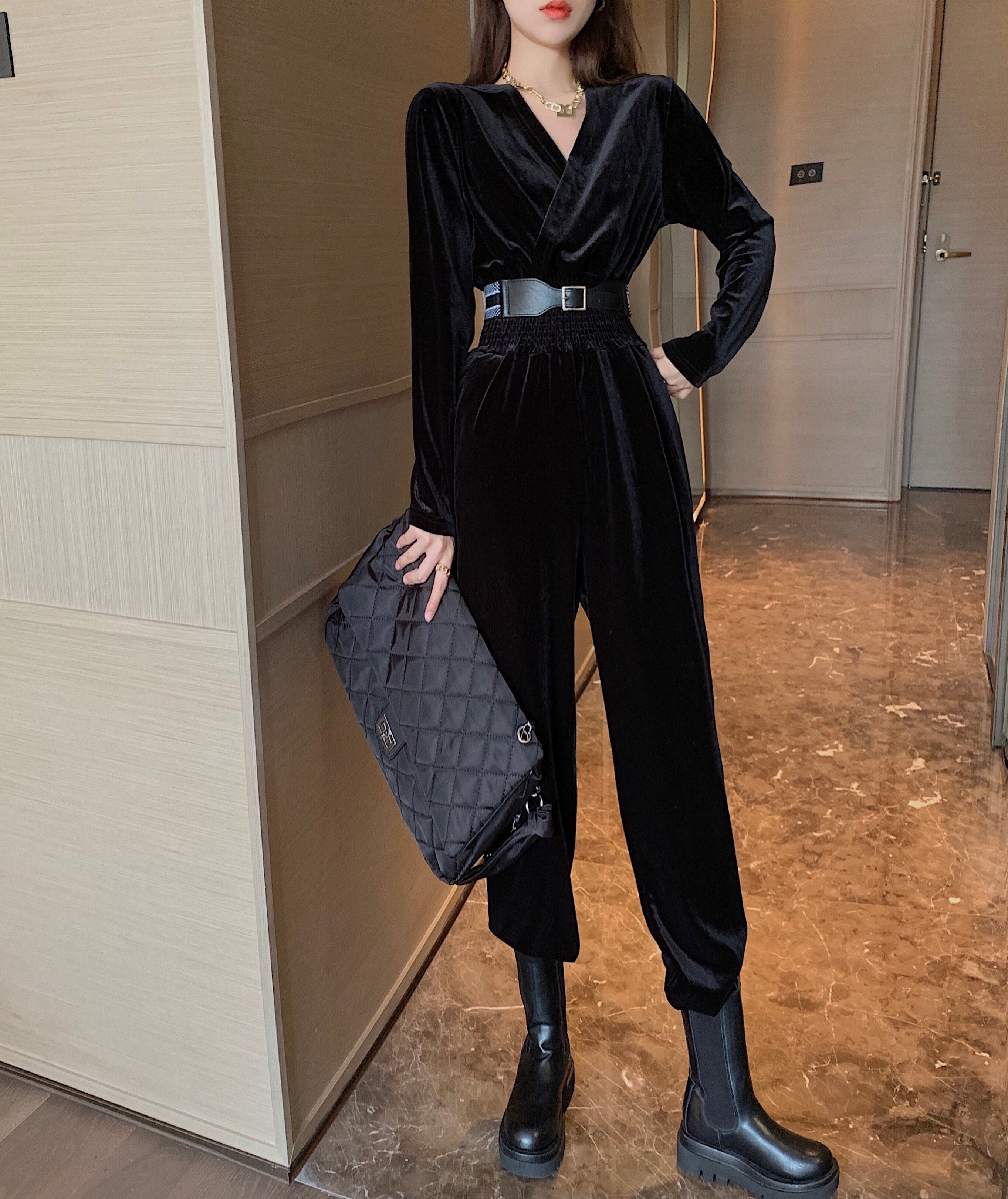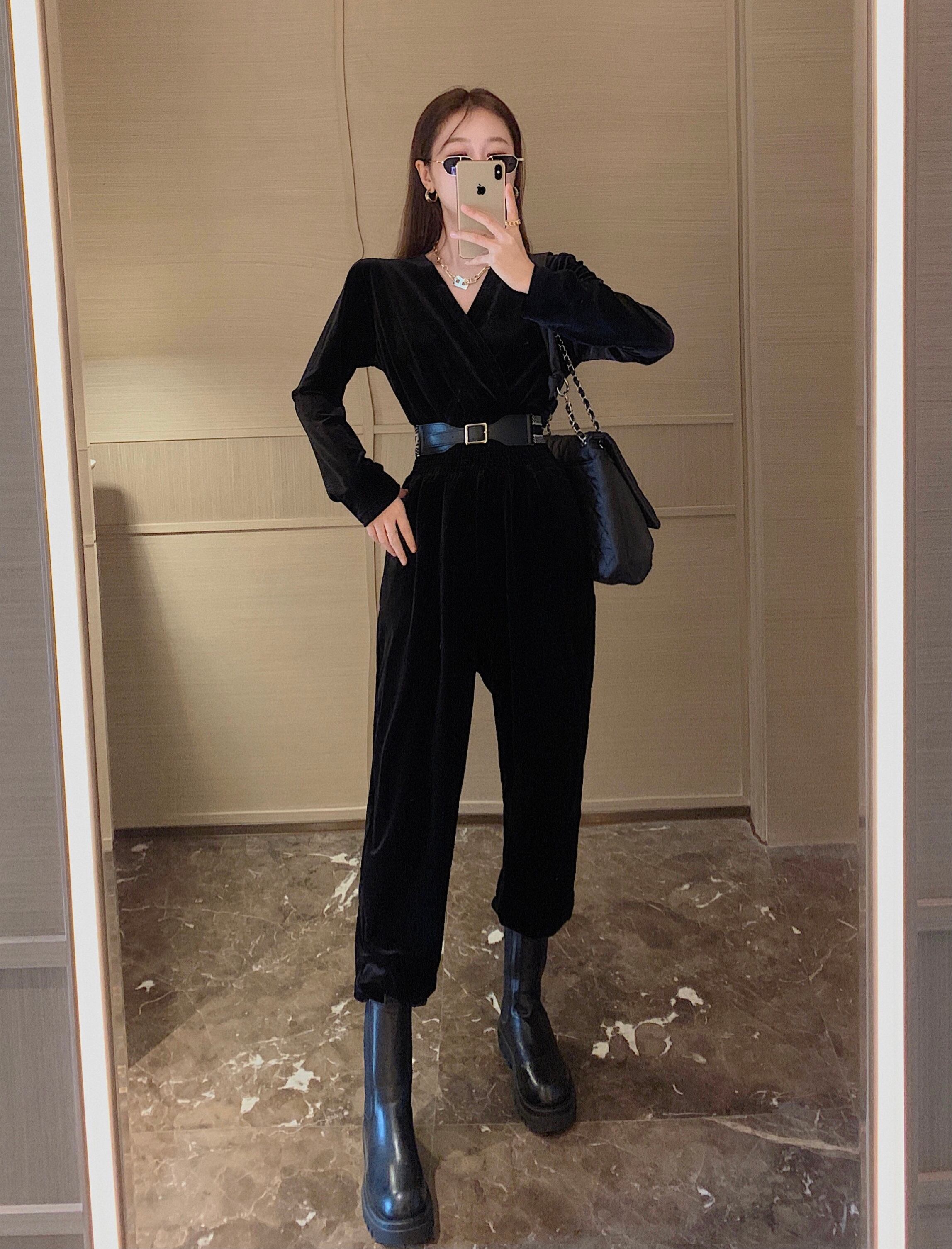 ジャンプスーツ オールインワン オータムVネック薄手ブラックベルベット ロング 秋物 ナナファッション11728951364