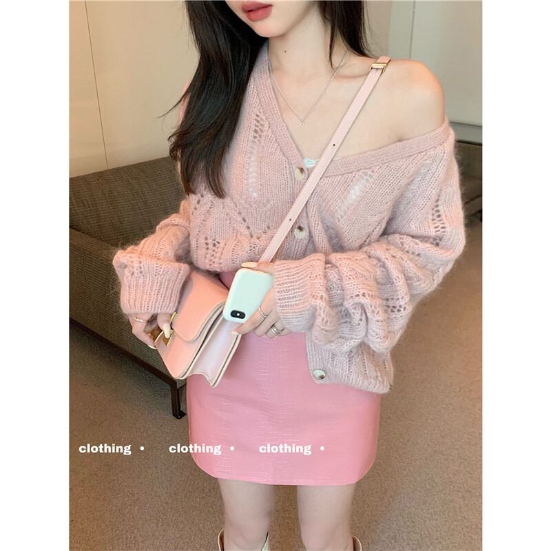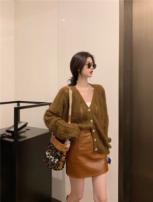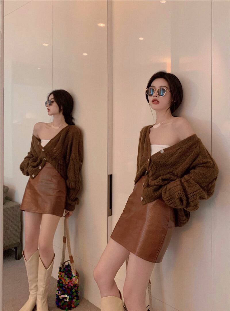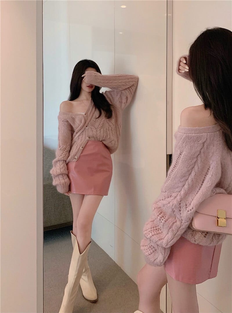 色:ピンクのセーター,茶色のセーター,コーヒークロコダイルレザースカート,ピンクのクロコダイルレザースカート
