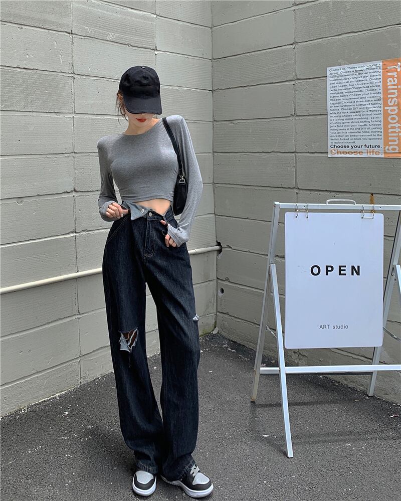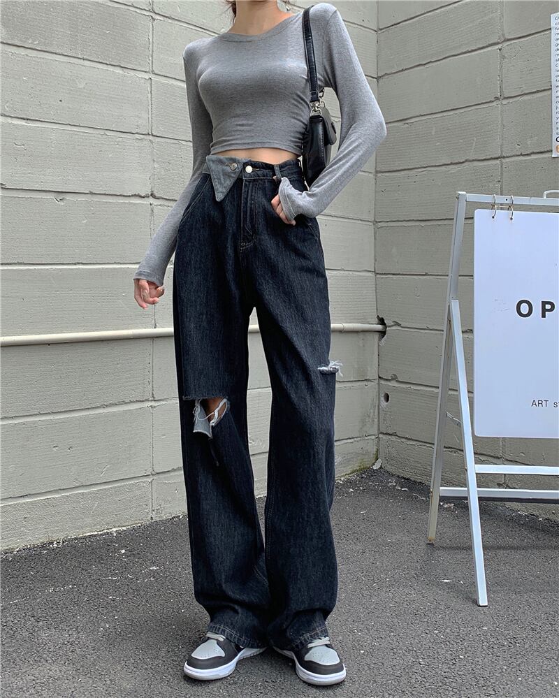 パンツ オータムカジュアルハイウェストウェストワイドレッグジーンズ 秋物 ワイドパンツ ナナファッション55415662639