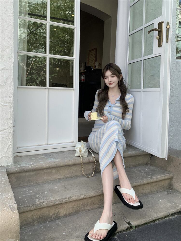 オータムレッドドレス 薄手ニットストライプカーディガンレディース ストリート 大人ガーリー スウィート キュート カジュアル 秋物 ナナファッション73124101604