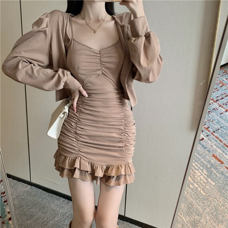 色:カーキカーディガン,カーキストラップドレス,ブラックカーディガン,ブラックサスペンダースカート