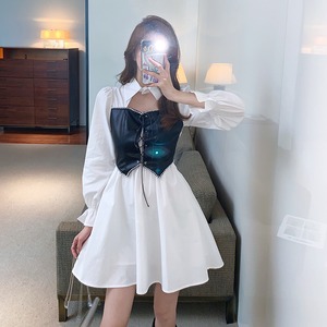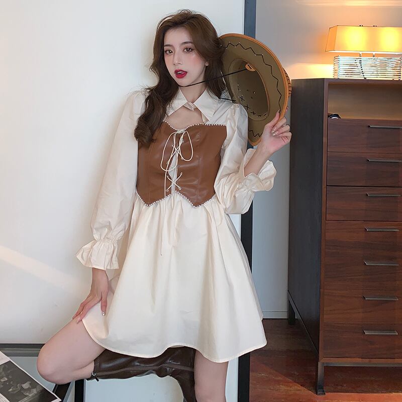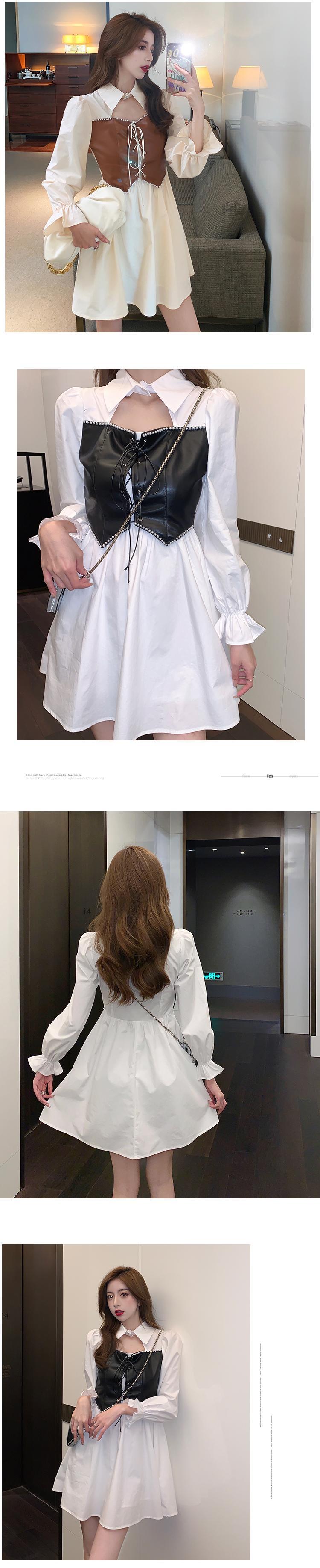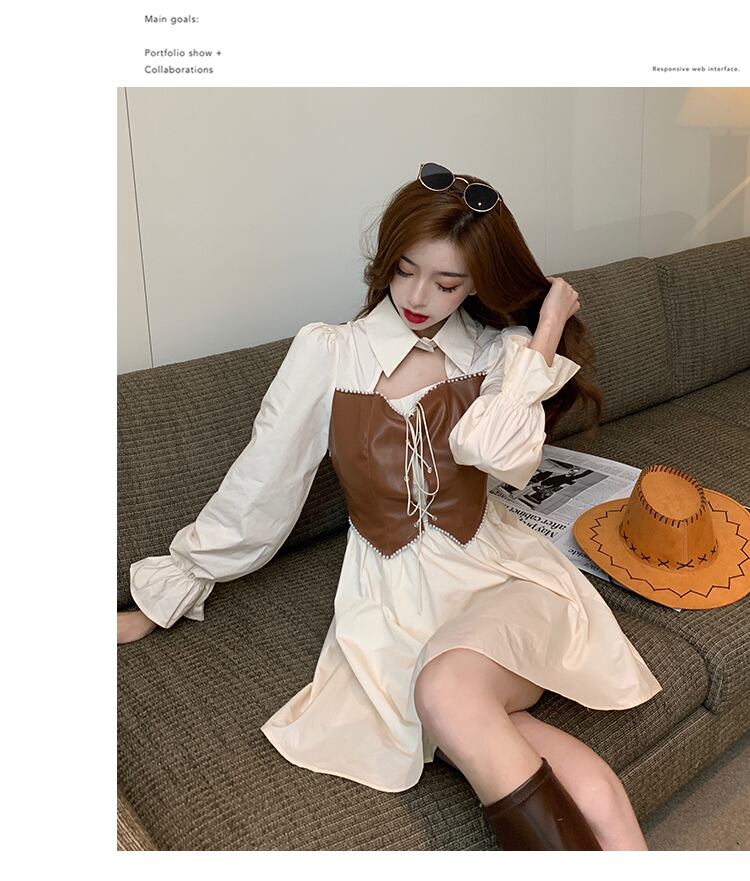 オータムウィンターレザーウェストシャツ カラー長袖スリーブドレス レディース ロング 秋物 冬物 ステッチ ナナファッション19620382285