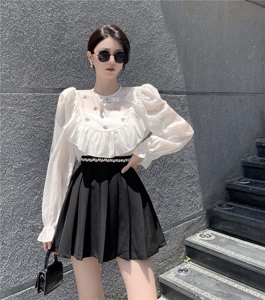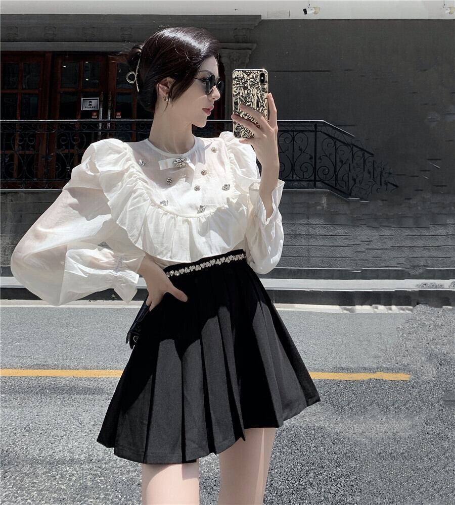 ラウンドネックスリーブスタイルシャツ ハイウェストウェストプリーツスカート Oネック ナナファッション94207670008