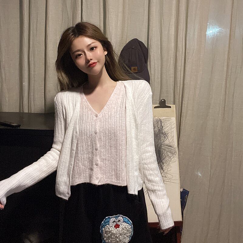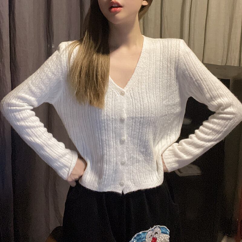 ソリッド カラークロップドトップス Vネックニットカーディガンセーター ソリッドカラー ナナファッション71211212973