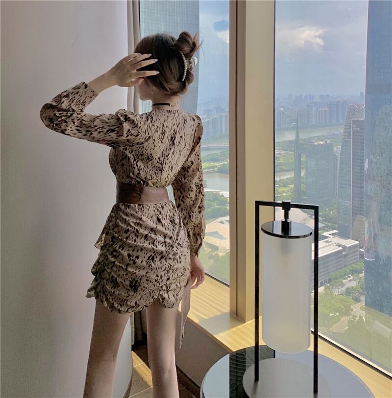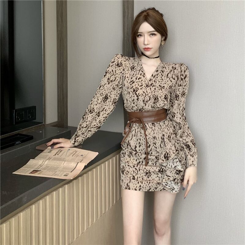 オータムスタイルレオパードプリント柄Vネックウェストドレス レディース ロング 秋物 ナナファッション67048949479