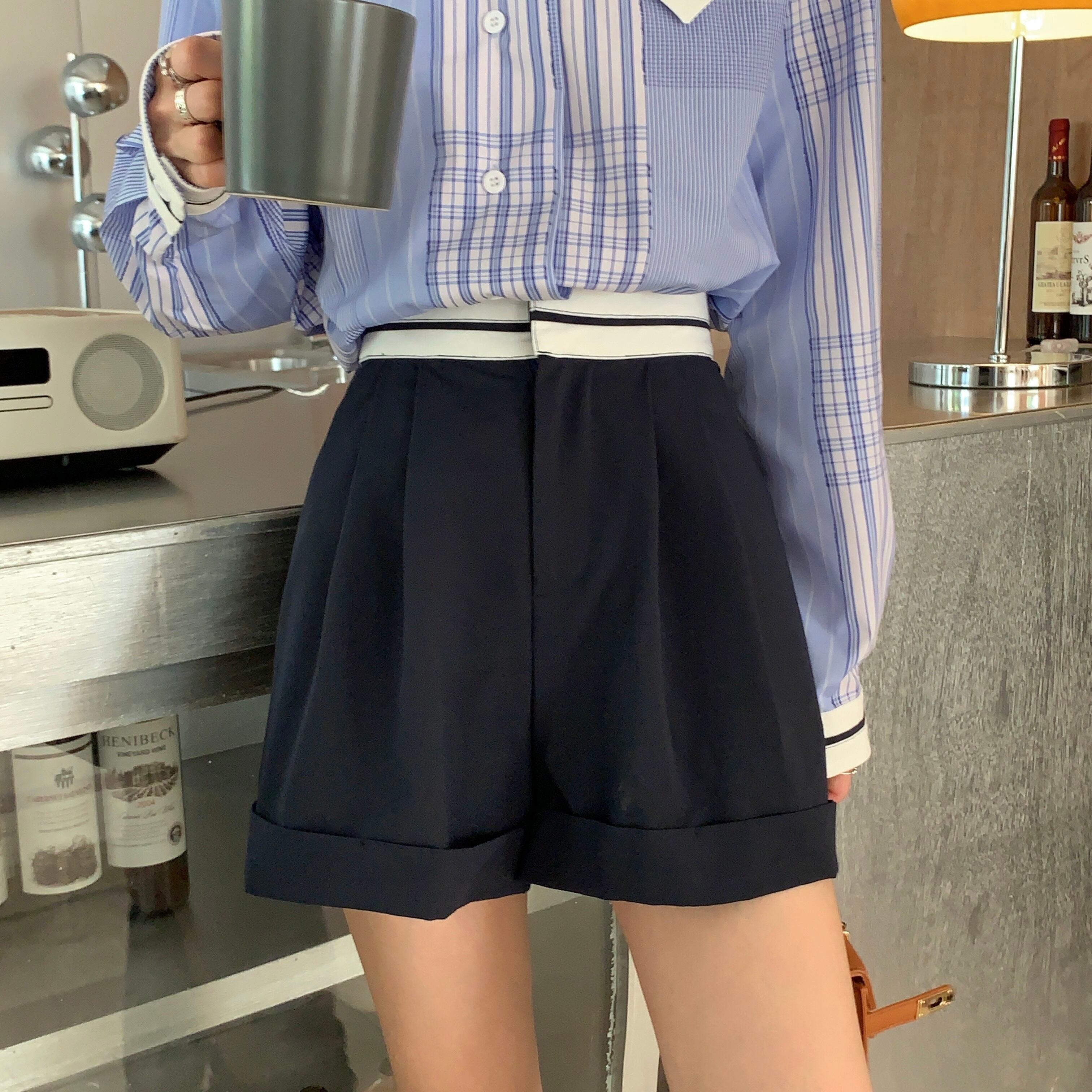 色:チェックシャツ,白のシャツ,ダークブルーのショートパンツ,ミルクコーヒーショーツ