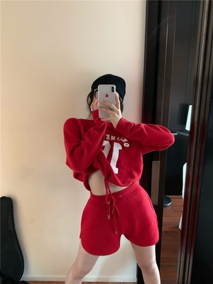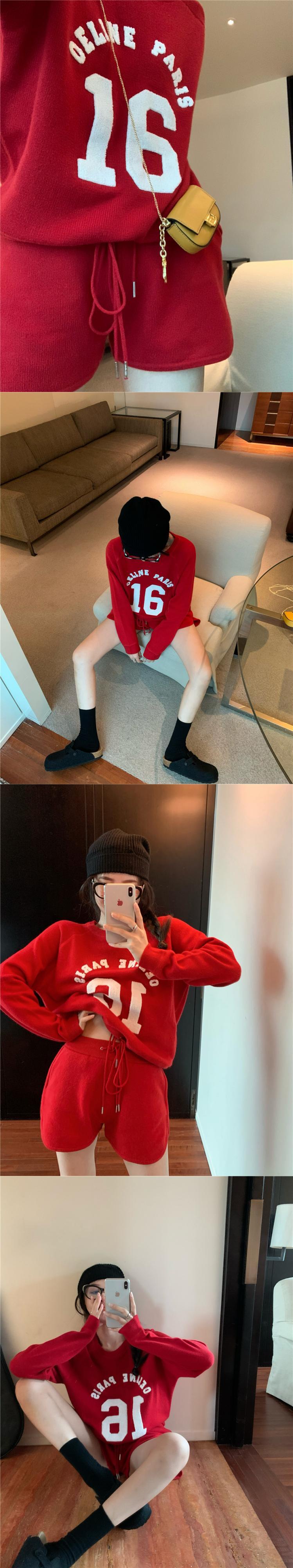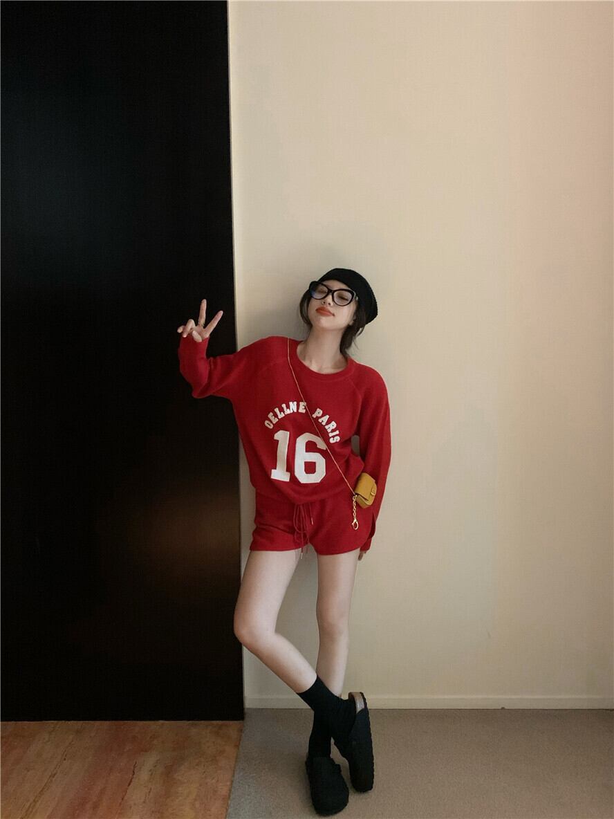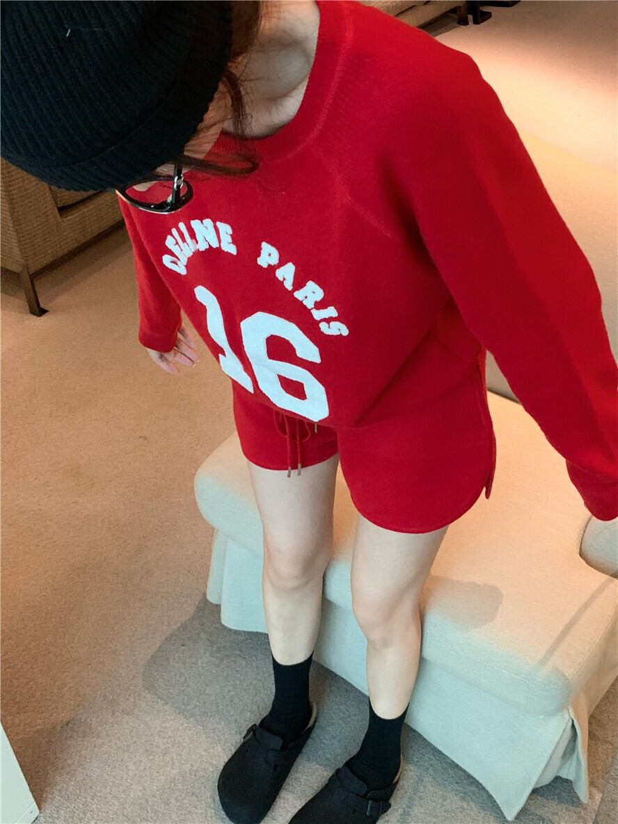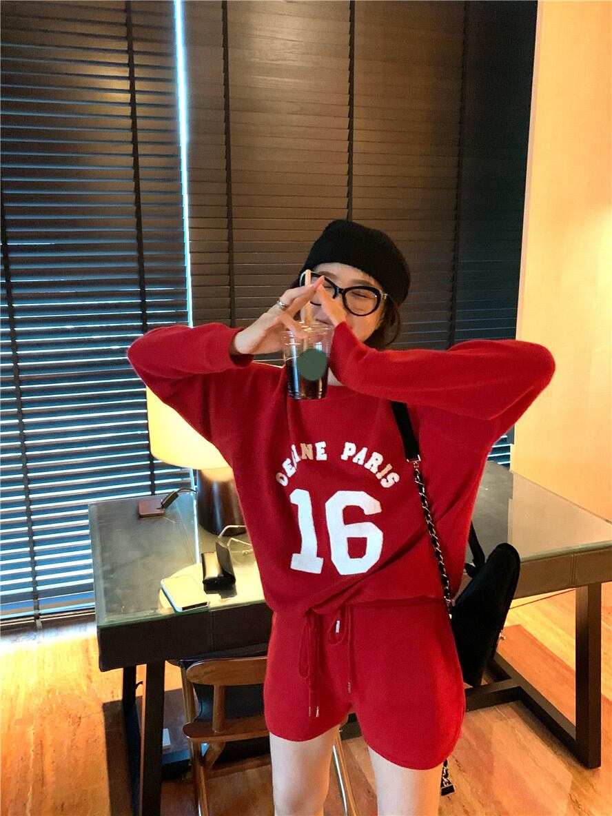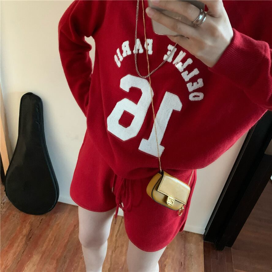 プリントラウンドネックニットトップス ハイウェストショーツ ロング ブルマー Oネック ナナファッション50059095319