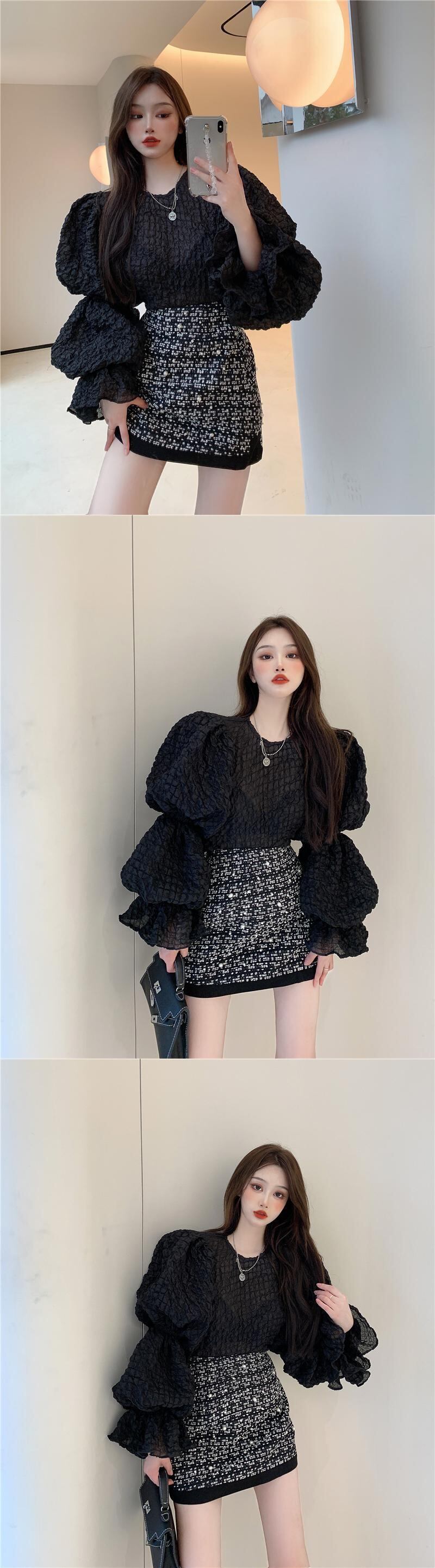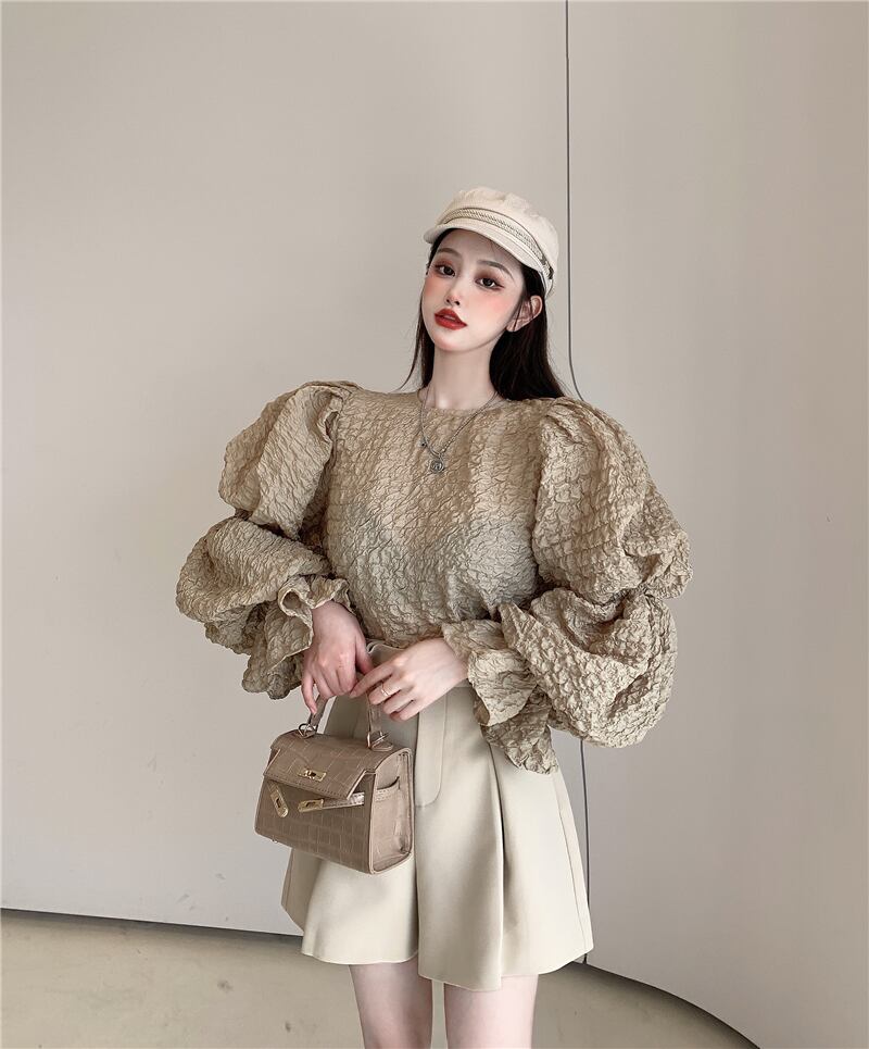 スリーブラウンドネックプリーツシャツ 薄手スカート ワイドレッグショーツ レディース ランタンスリーブ ブルマー Oネック ワイドパンツ ナナファッション37222960305