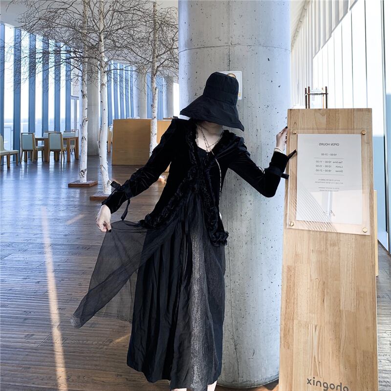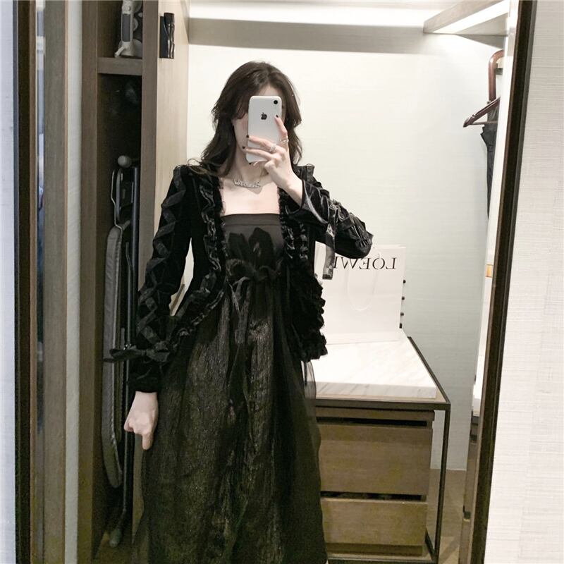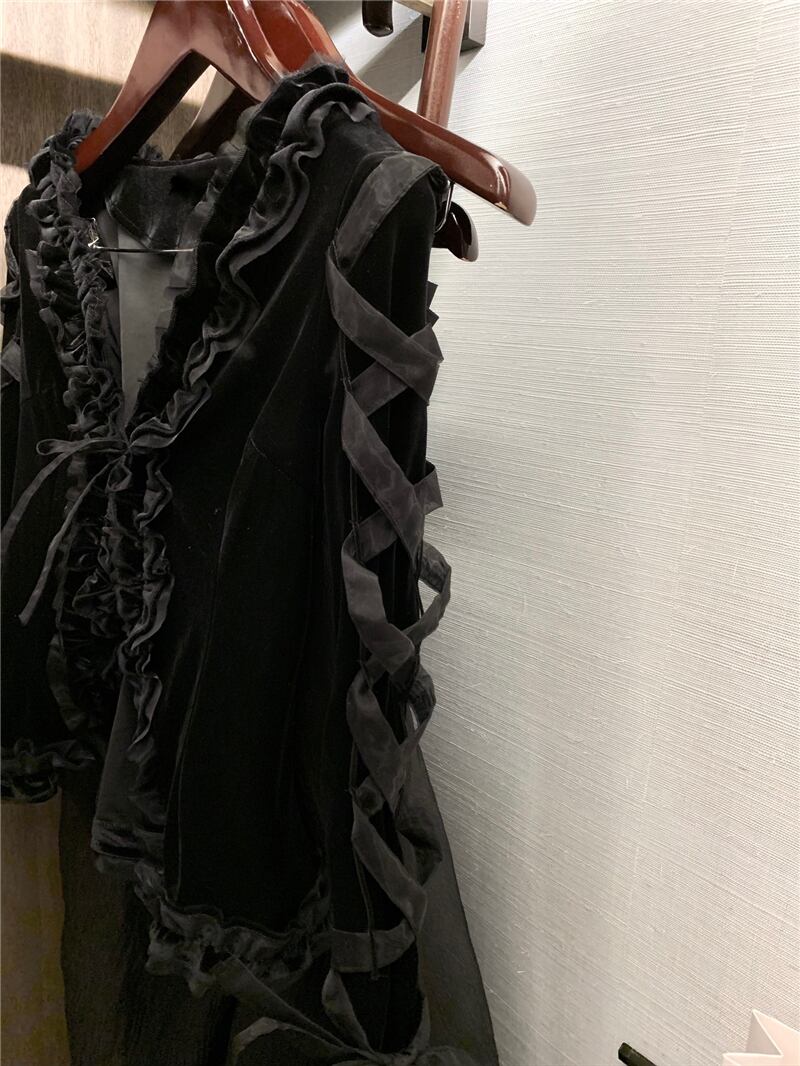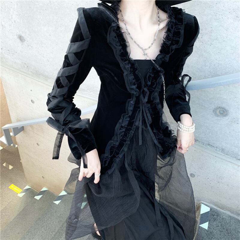 スタンダードベルベットジャケット ロングスカート オータム レトロ レース 秋物 レースアップ ナナファッション4230316751
