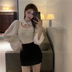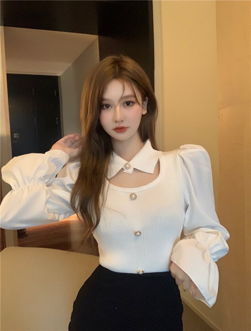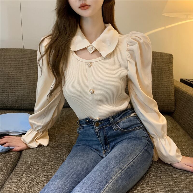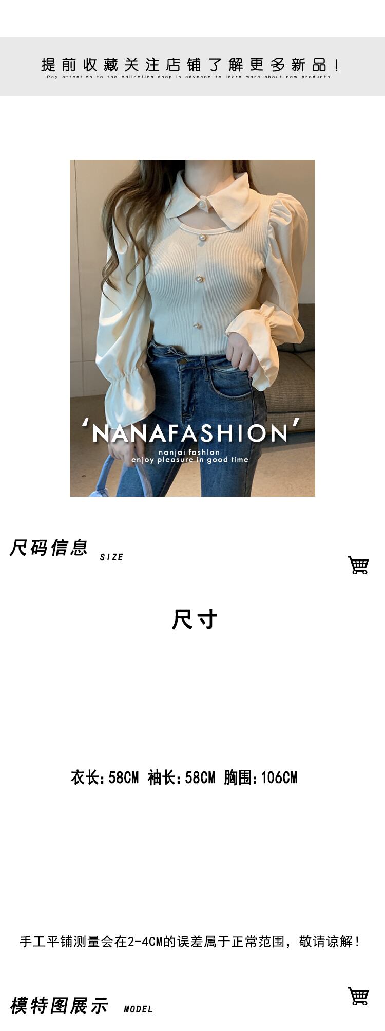 カラーニット シャツ スリーブ長袖トップス ロング ステッチ ナナファッション68916438645