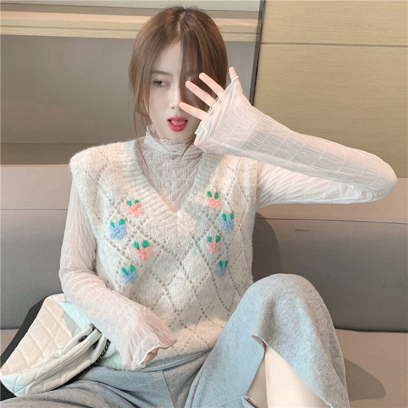 スタンダードラウンドネック刺繍ノースリーブセーター メッシュシャツ スタイルレディース レトロ Oネック フラワーデザイン ナナファッション16388885445